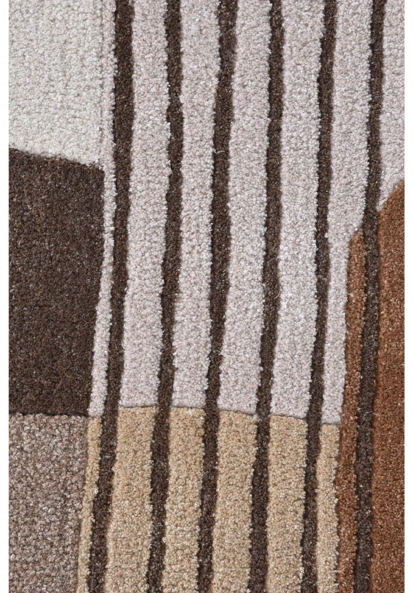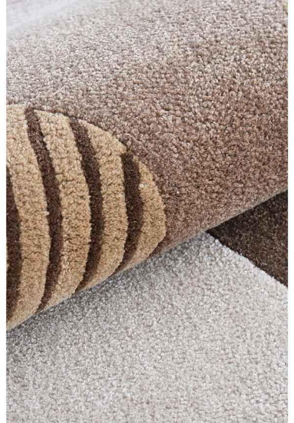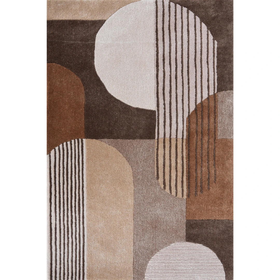 This modern abstract rug features a captivating design with a rich, earthy color palette. The pattern is composed of overlapping geometric shapes, including large circles and arched forms in various shades of brown, beige, and cream. Some shapes are filled with solid colors, while others are adorned with bold, vertical stripes, creating a dynamic and layered effect. Made from 100% pure New Zealand wool, this rug has a plush 15-20mm pile height for a soft, luxurious feel. Its anti-skid backing, along with eco-friendly and pet-friendly colors, makes it an ideal choice for adding warmth and sophisticated style to a living room, bedroom, or office.