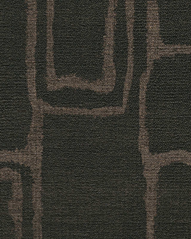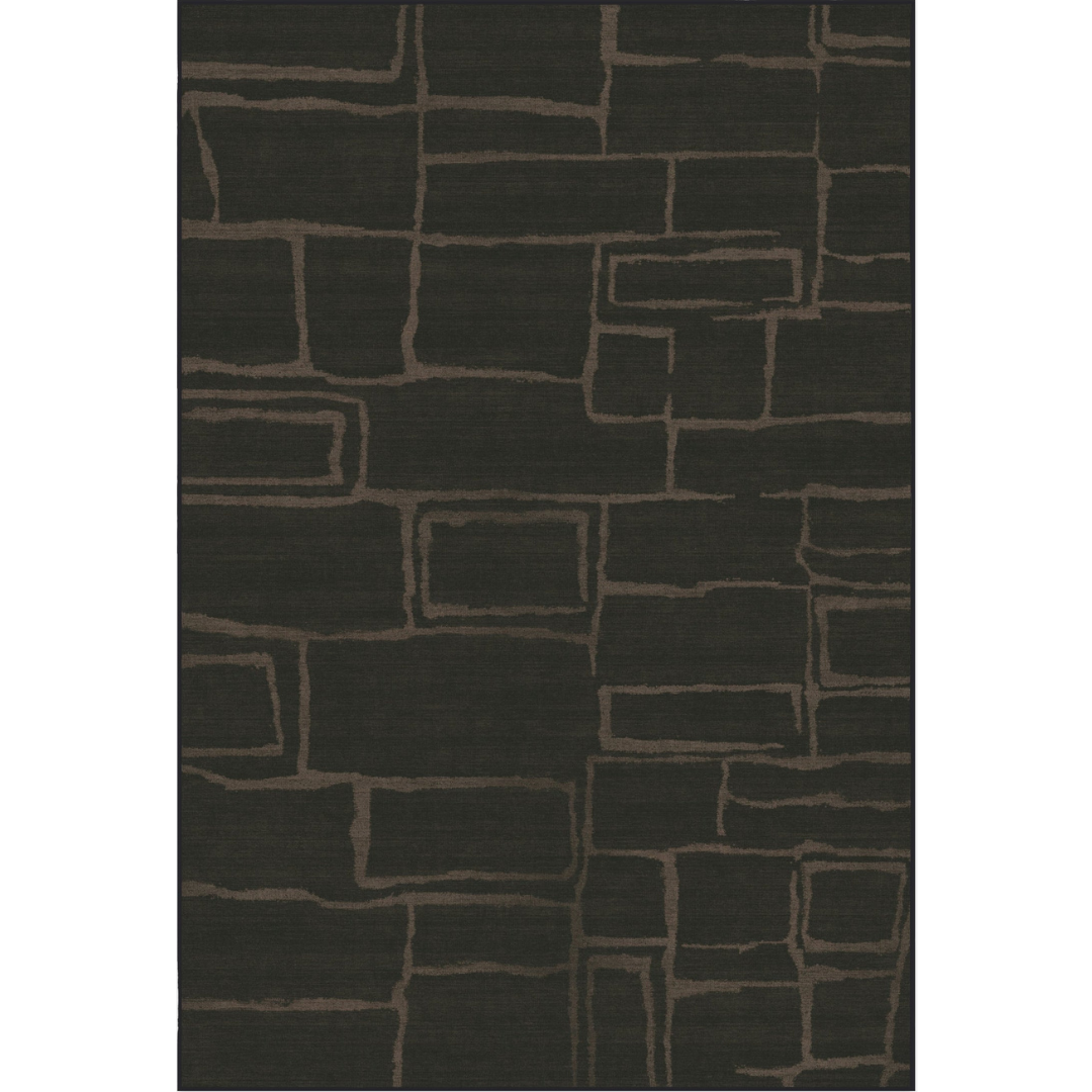 This elegant rug features a sophisticated, modern design with a subtle, graphic pattern. The design consists of a rich, dark brown background with a textured, woven appearance, accented by irregular, hand-drawn rectangular outlines and shapes in a lighter brown. This pattern evokes the look of a stone or brick wall, creating a sense of natural, rustic charm with a modern edge. Crafted from 100% pure New Zealand wool, this rug has a plush 15-20mm pile height. The anti-skid backing, along with eco-friendly and pet-friendly colors, makes it a durable and safe choice for a cozy living room, an office, or a stylish entryway, adding both texture and visual interest to the space.