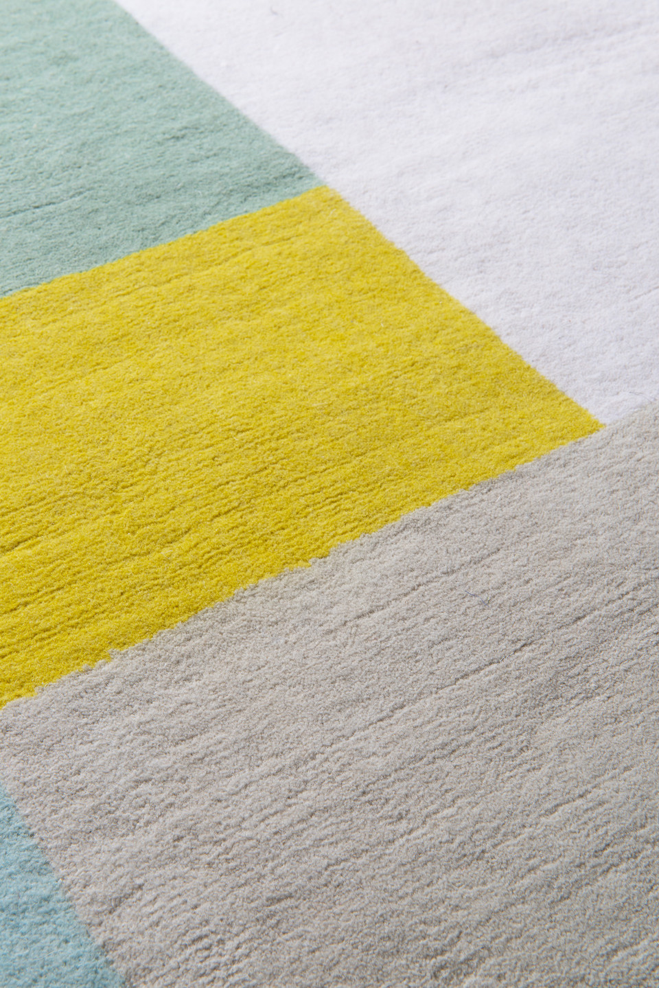 This elegant rug showcases a minimalist, color-block design with a soft and serene aesthetic. The pattern is composed of large, intersecting rectangular blocks in a delicate pastel color palette, featuring shades of muted pink, sky blue, sage green, and beige, with a single pop of vibrant yellow. The clean lines and tranquil hues create a calming, contemporary feel. Crafted from 100% pure New Zealand wool with a 15-20mm pile height, it provides exceptional comfort. The anti-skid backing, along with eco-friendly and pet-friendly colors, makes it a durable and safe choice for a nursery, bedroom, or a light-filled living room, adding a touch of modern sophistication.