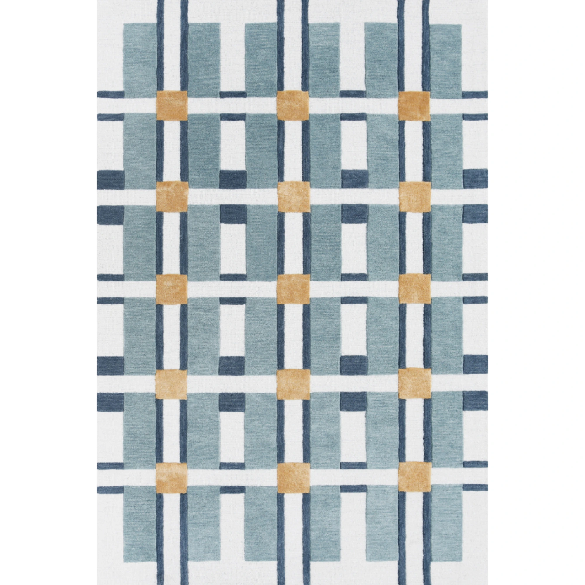 This modern rug, crafted from 100% pure New Zealand wool, features a striking geometric pattern. The design consists of a grid-like structure with intersecting bands of varying shades of blue and white, accented by golden-tan squares at the intersections. The vibrant color palette creates a sophisticated, interlocking look. With a plush 15-20mm pile height, this rug offers a luxurious feel underfoot. Its anti-skid backing and eco-friendly, pet-friendly colors make it a practical and stylish choice for high-traffic areas like a living room or study. The intricate design and rich texture would beautifully anchor a minimalist or contemporary space.