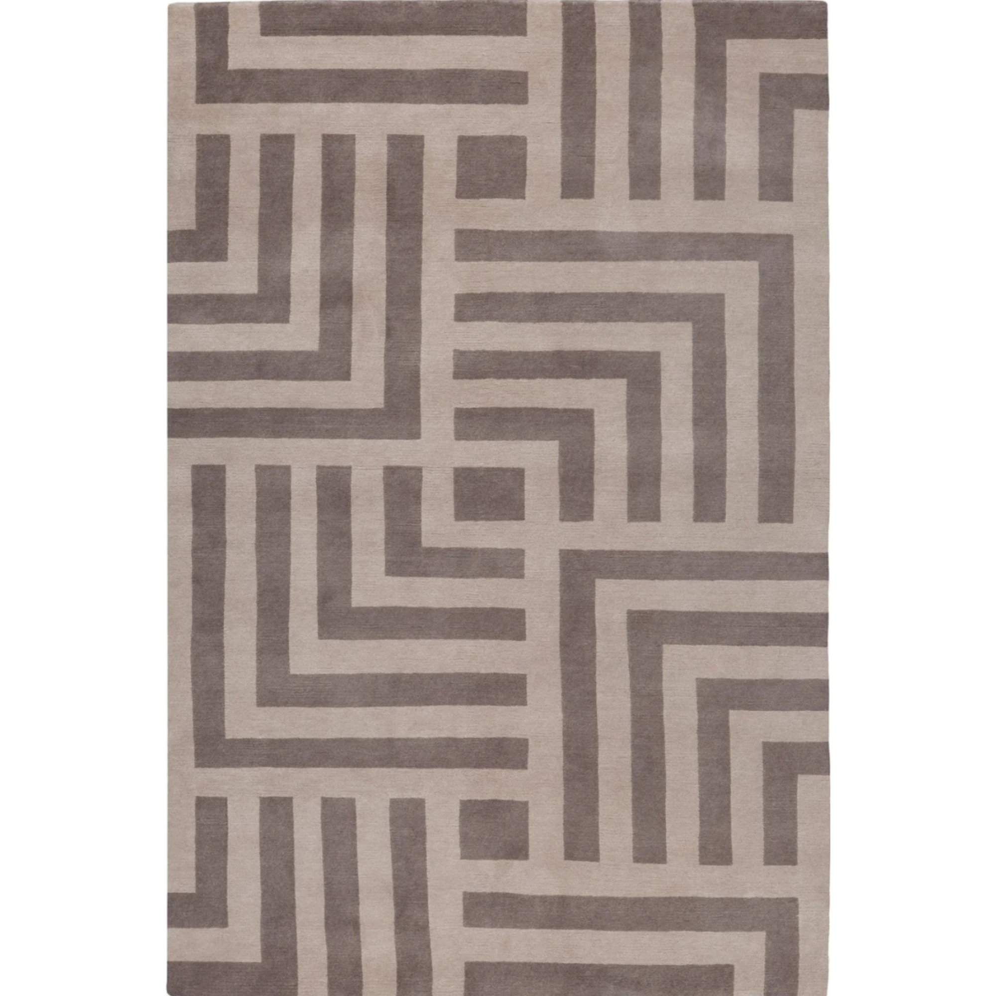 This sophisticated rug features a bold, geometric maze-like pattern in a neutral, monochromatic color scheme. The design consists of thick, angular lines and interlocking right angles in a deep taupe hue, set against a lighter beige-taupe background. This intricate pattern creates a sense of depth and movement, giving the rug a modern and architectural feel. Made from 100% pure New Zealand wool, it boasts a luxurious 15-20mm pile height. The anti-skid backing, along with eco-friendly and pet-friendly colors, makes it a durable and safe choice. This rug is a perfect statement piece for a minimalist living room or a contemporary office, adding a touch of bold elegance.